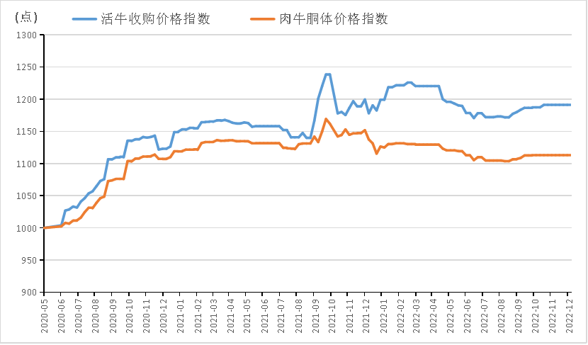 截至2022年12月5日,阳信活牛收购价格指数报1191.34点,环比(2022年11月7日,下同)持平;阳信肉牛胴体价格指数报1113.15点,环比持平。