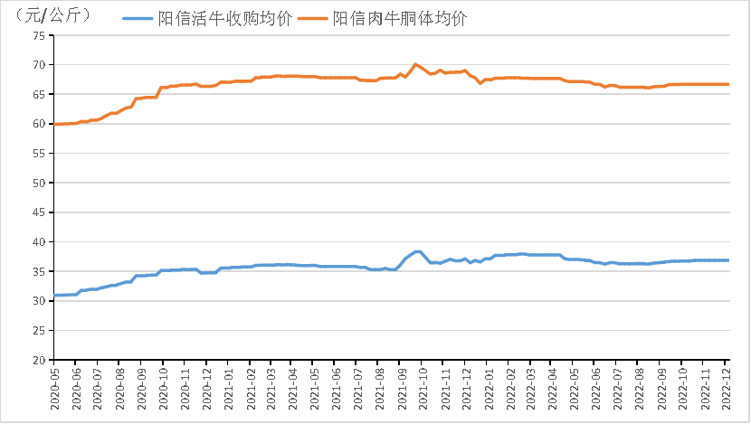 具体价格方面,截至2022年12月5日,阳信活牛收购均价报36.87元/公斤,肉牛胴体均价报66.69元/公斤,环比持平。