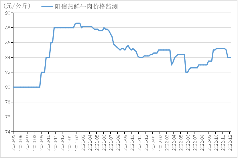 阳信热鲜牛肉价格监测数据显示,截至2022年12月5日,阳信热鲜牛肉价格报84元/公斤,环比下跌1.41%。